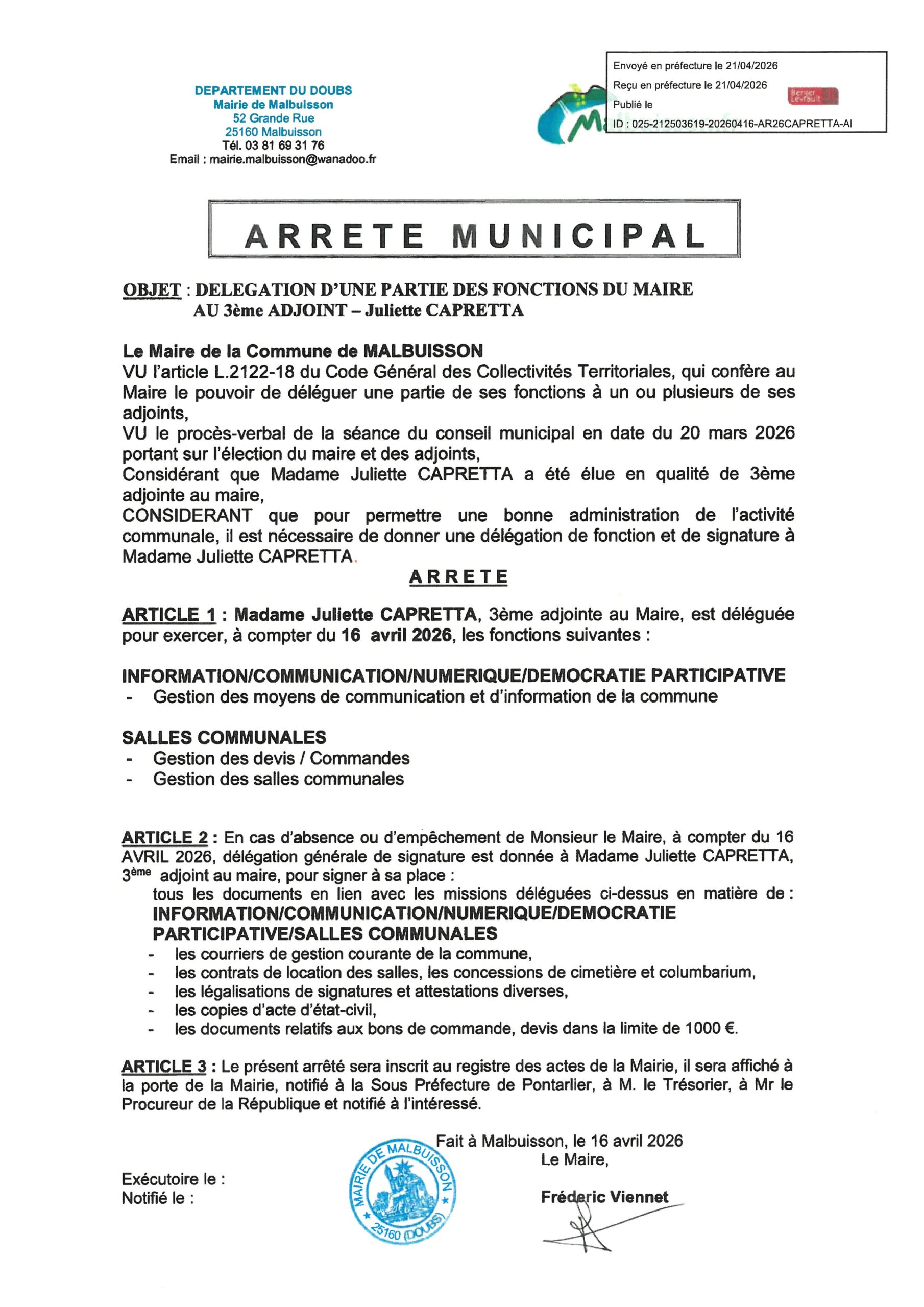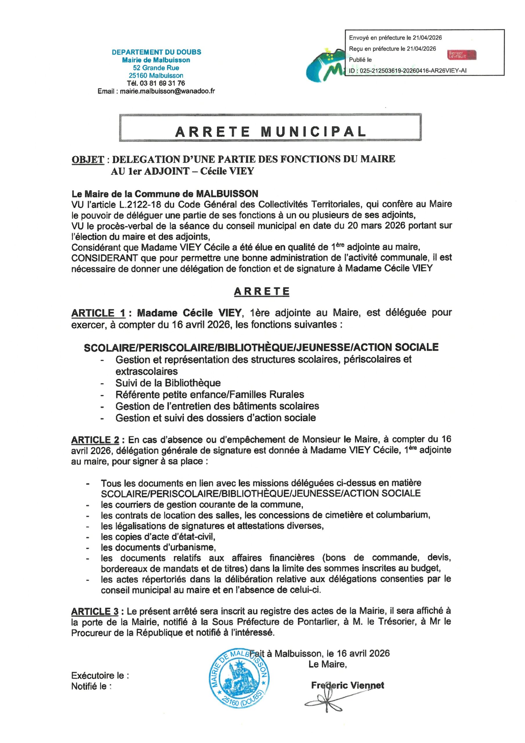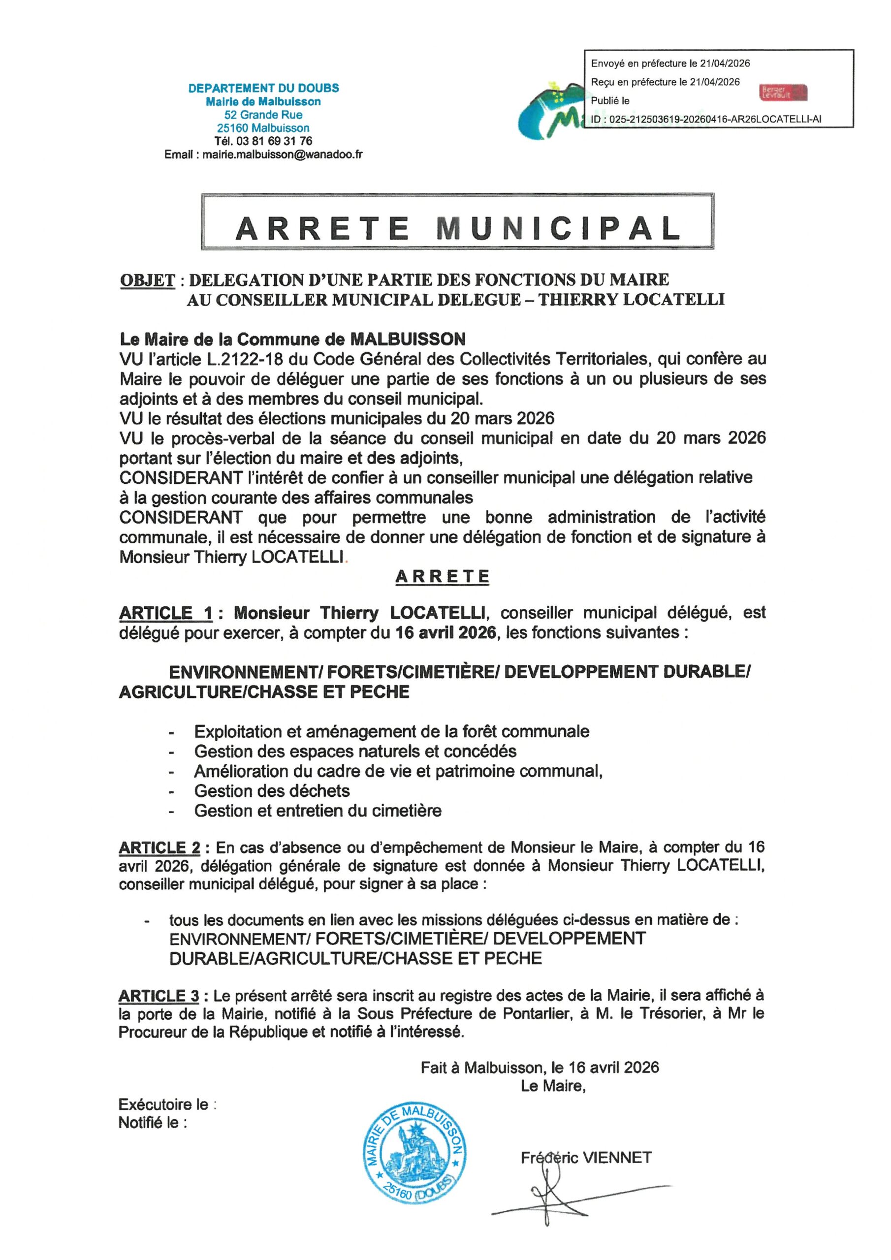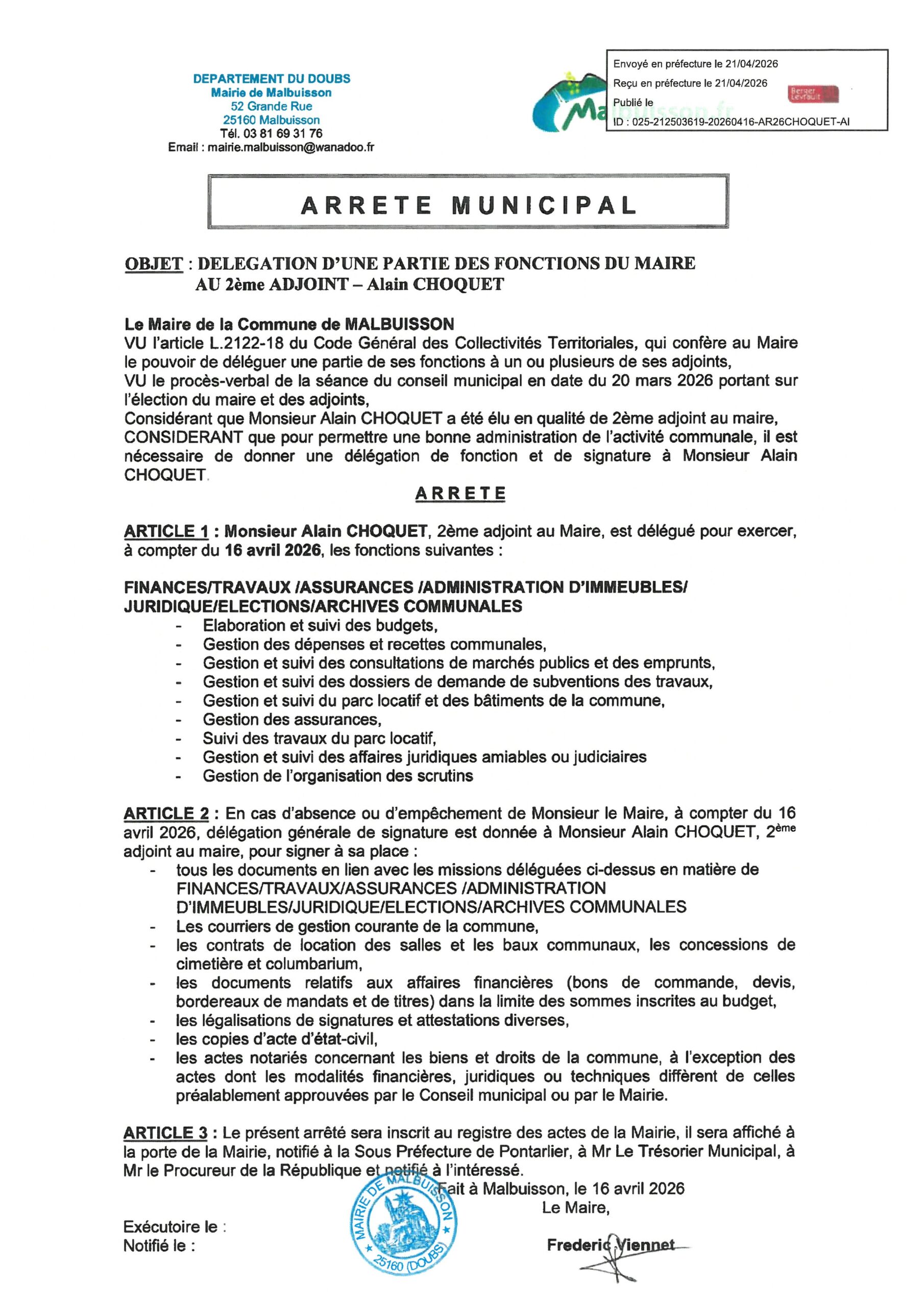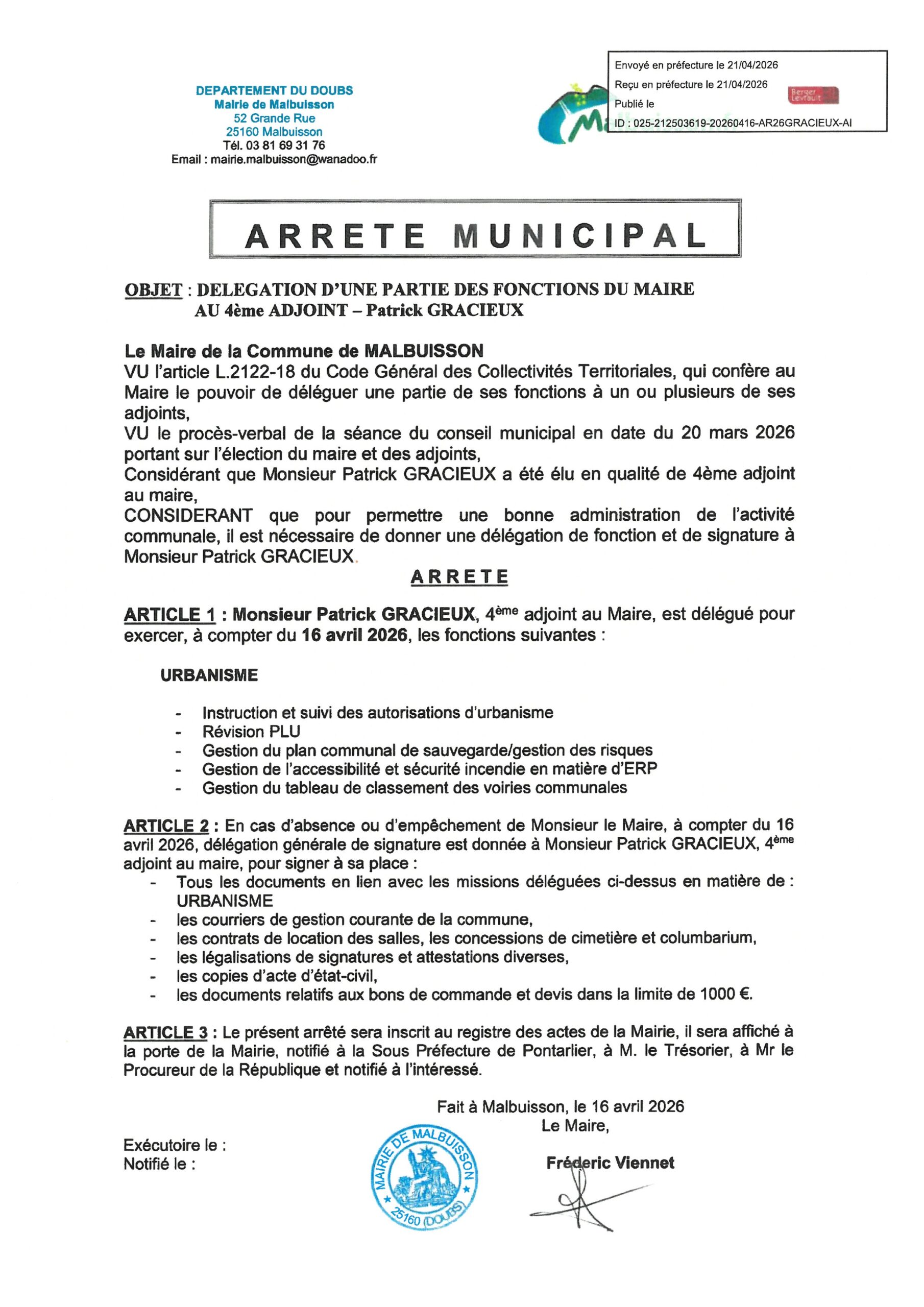 ARRETES DE DELEGATIONS DE FONCTIONS DU MAIRE aux adjoints et conseillers municipaux – 16/04/2026